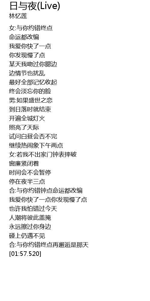 | [01:44.30] | hé: yǔ nǐ yuē cuò zhōng diǎn zài xiè hòu shì nà tiān |