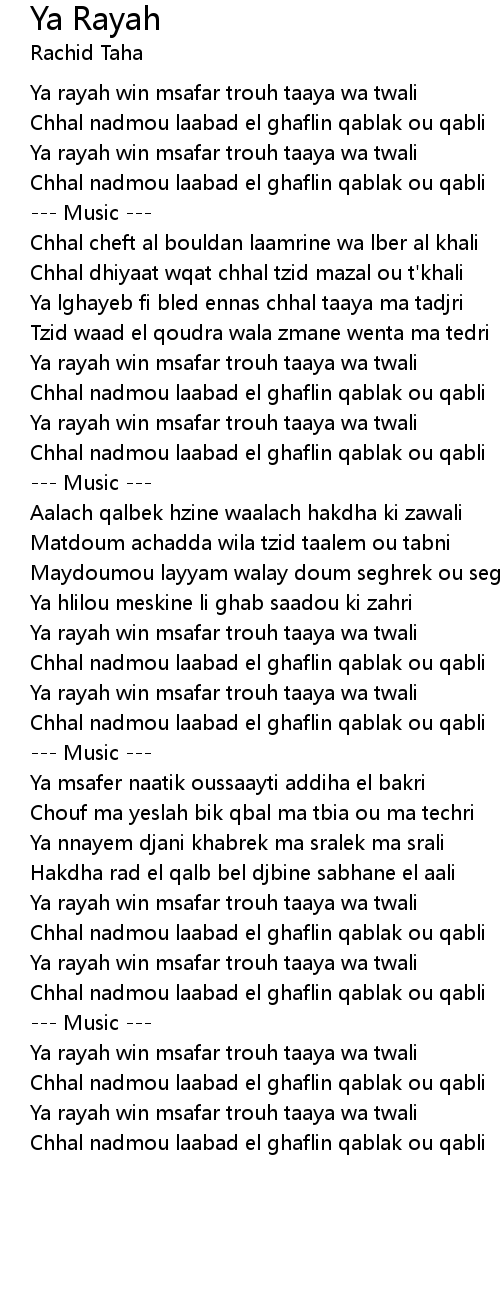 Ya rayah win msafar trouh taaya wa twali |