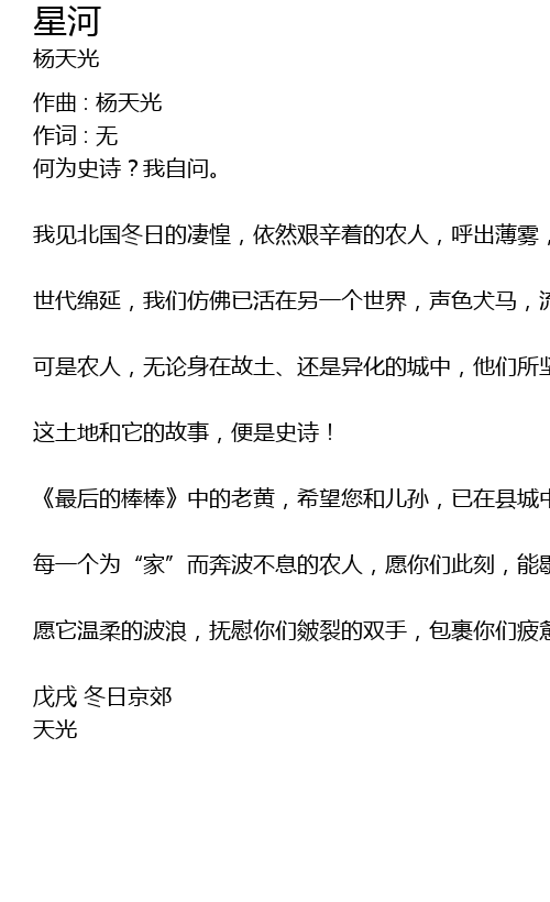 | měi yí gè wèi" jiā" ér bēn bō bù xī de nóng rén, yuàn nǐ men cǐ kè, néng xiē le shǒu lǐ de láo kǔ, yǎng wàng tóu dǐng de xīng hé! | |