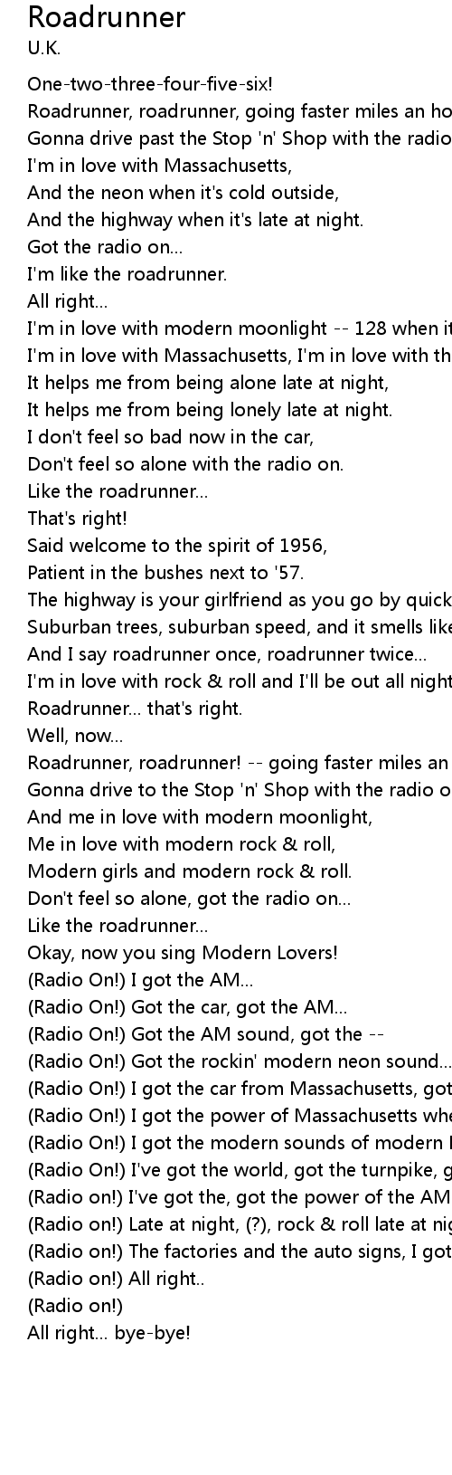 Roadrunner, roadrunner! -- going faster miles an hour. |