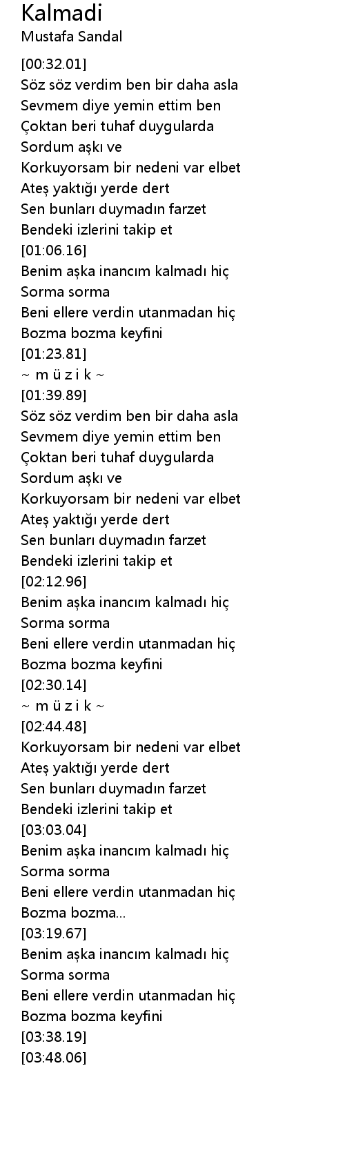 | [03:19.77] | Benim a ka inanc m kalmad hi |