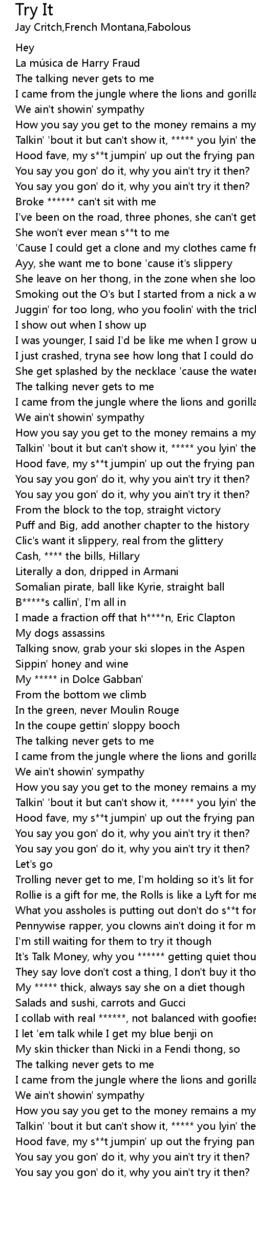 | [03:01.43] | Hood fave, my s**t jumpin' up out the frying pan |