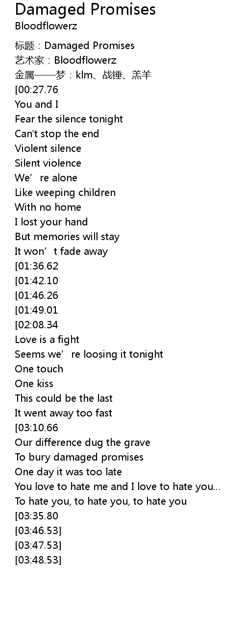 | [01:04.03][01:49.01][02:06.34][03:08.80][03:25.91] | Damaged promises |