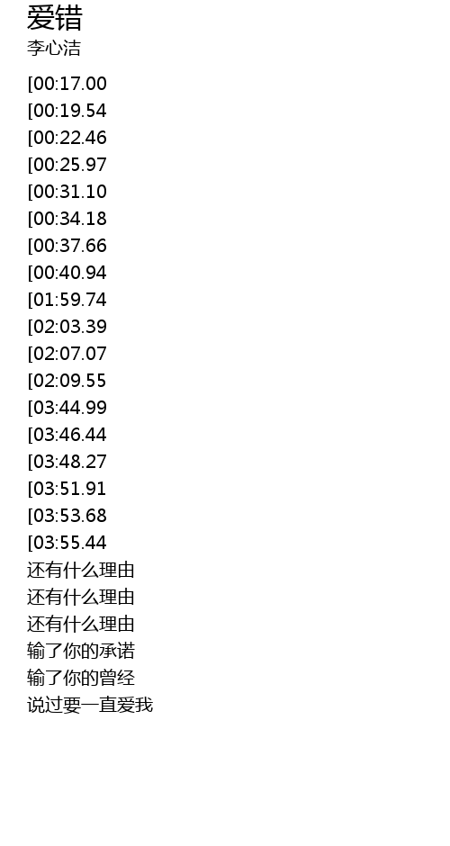 | [03:59.76][03:44.99][03:29.86][03:15.15][02:30.17][02:15.37][01:15.57][01:00.68] | 还有什么理由 |