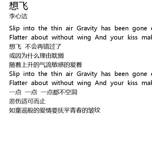 | [01:35.04] | Flatter about without wing And your kiss makes me wegihtless |