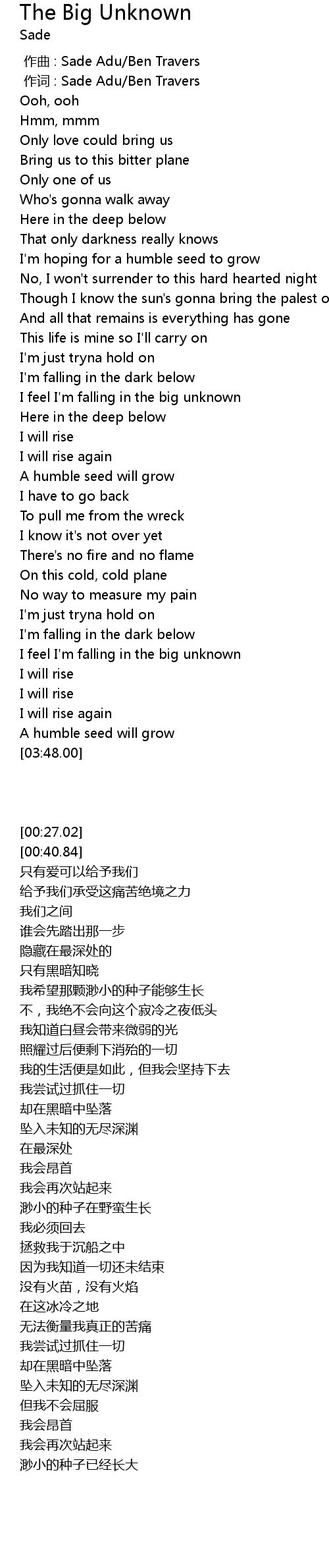 | [03:25.53] | I feel I' m falling in the big unknown |