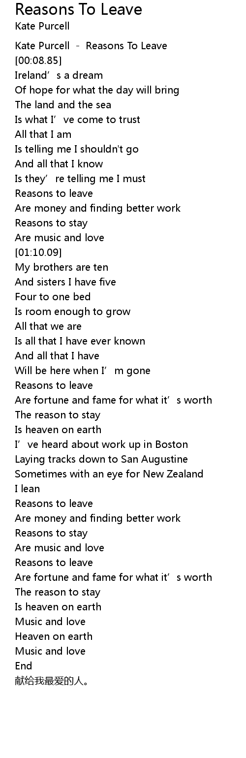 | [00:06.18] | Kate Purcell Reasons To Leave |