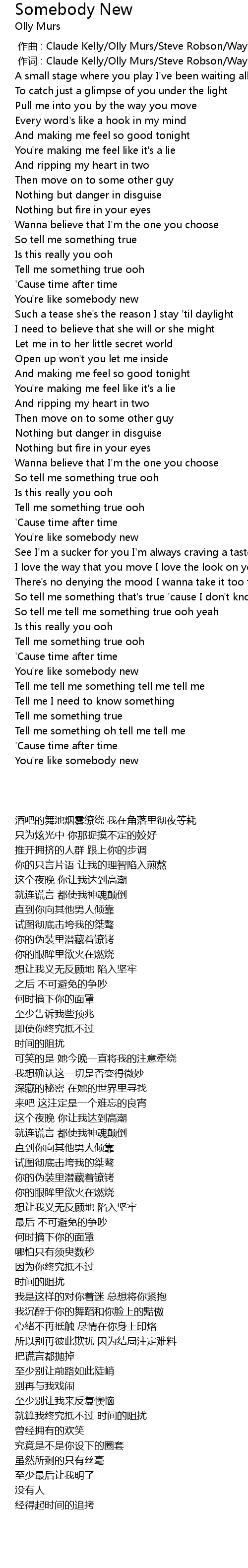 | [00:01.000] | zuò cí : Claude Kelly Olly Murs Steve Robson Wayne Hector |
