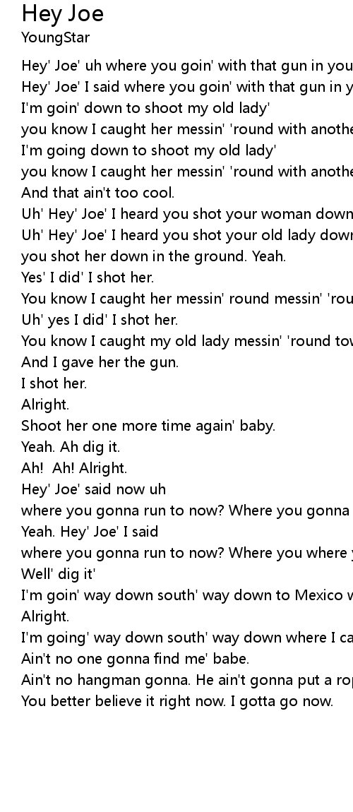 Hey' Joe' I said where you goin' with that gun in your hand? Alright. |