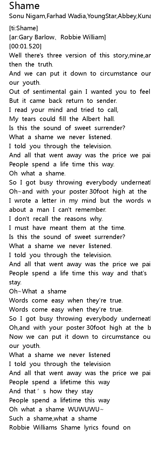 | [03:47.938] | Robbie Williams Shame lyrics found on |
