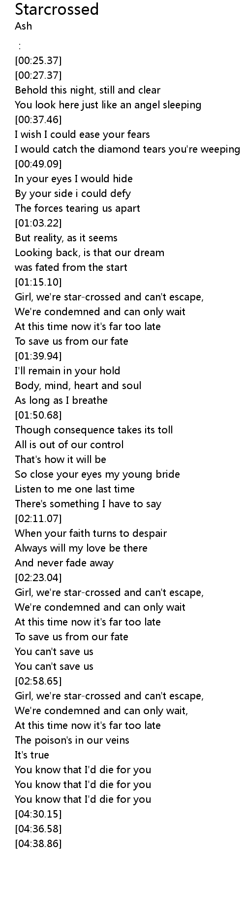 | [03:22.27] | Girl, we're star-crossed and can't escape, |