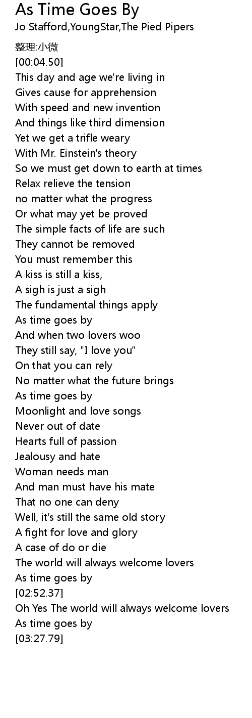 | [03:05.18] | Oh Yes The world will always welcome lovers |
