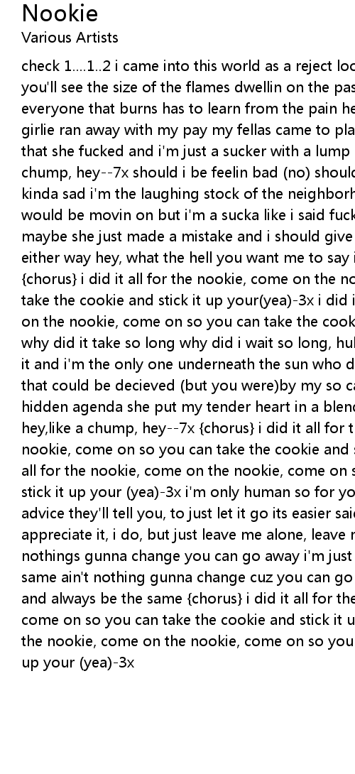 check 1....1..2 i came into this world as a reject look into these eyes then you'll see the size of the flames dwellin on the past its burnin up my brain everyone that burns has to learn from the pain hey, i think about the day my girlie ran away with my pay my fellas came to play now shes stuck with my homies that she fucked and i'm just a sucker with a lump in my throat hey, like a chump, hey--7x should i be feelin bad (no) should i be fellin good (no) its kinda sad i'm the laughing stock of the neighborhood and you would think that i would be movin on but i'm a sucka like i said fucked up in the head, not and maybe she just made a mistake and i should give her a break my heart'll ache, either way hey, what the hell you want me to say i won't lie that i can't deny {chorus} i did it all for the nookie, come on the nookie, come on so you can take the cookie and stick it up your(yea)-3x i did it all for the nookie, come on the nookie, come on so you can take the cookie and stick it up your (yea)-3x why did it take so long why did i wait so long, huh to figure it out but i did it and i'm the only one underneath the sun who didn't get it i can't believe that could be decieved (but you were)by my so called girl, but in reality had a hidden agenda she put my tender heart in a blender and still i surrendered hey,like a chump, hey--7x {chorus} i did it all for the nookie, come on the nookie, come on so you can take the cookie and stick it up your(yea)-3x i did it all for the nookie, come on the nookie, come on so you can take the cookie and stick it up your (yea)-3x i'm only human so for your friends give you their advice they'll tell you, to just let it go its easier said than done i appreciate it, i do, but just leave me alone, leave me alone just leave me alone nothings gunna change you can go away i'm just gunna stay here and always be the same ain't nothing gunna change cuz you can go away and i'm just gunna stay here and always be the same {chorus} i did it all for the nookie, come on the nookie, come on so you can take the cookie and stick it up your(yea)-3x i did it all for the nookie, come on the nookie, come on so you can take the cookie and stick it up your (yea)-3x |