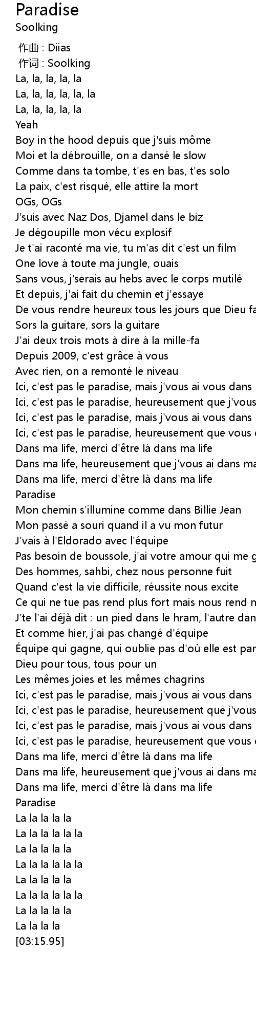 | [02:33.68] | Ici, c' est pas le paradise, heureusement que vous tes dans ma life |