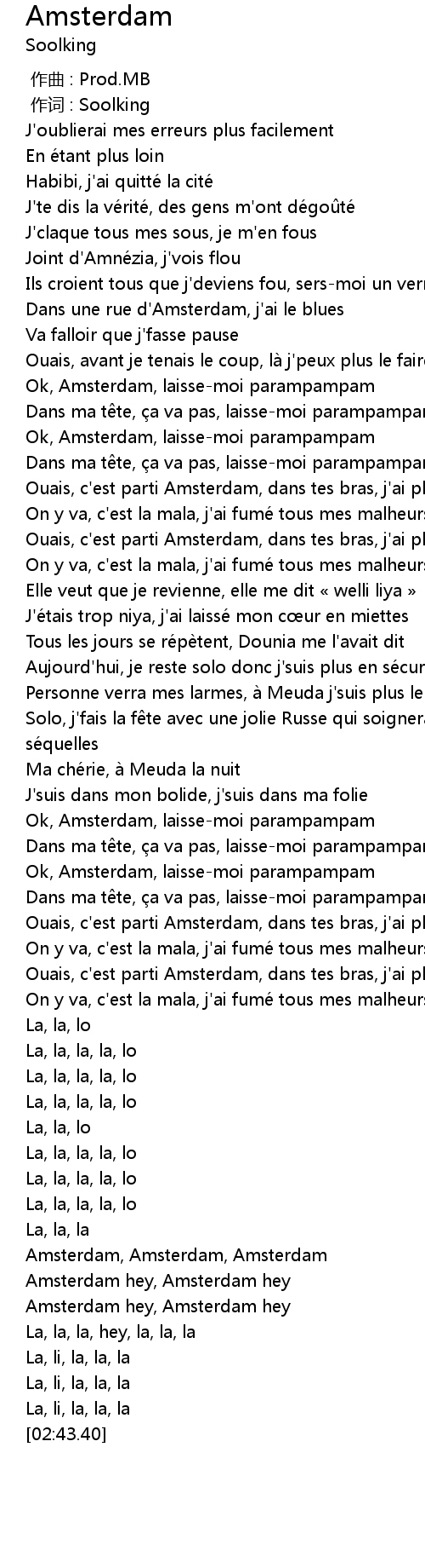 | [00:43.80] | Ok, Amsterdam, laisse-moi parampampam |