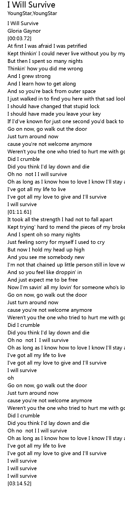| [00:55.91] | Oh no not I I will survive |