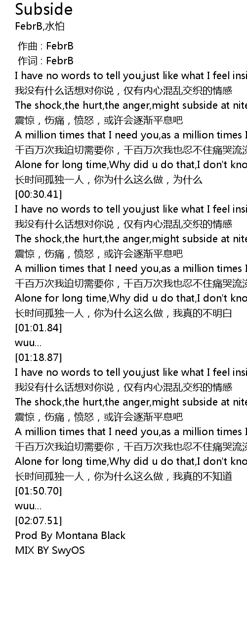 | [01:43.13] | Alone for long time, Why did u do that, I don' t know why zhǎng shí jiān gū dú yī rén, nǐ wèi shí me zhè me zuò, wǒ zhēn de bù zhī dào |