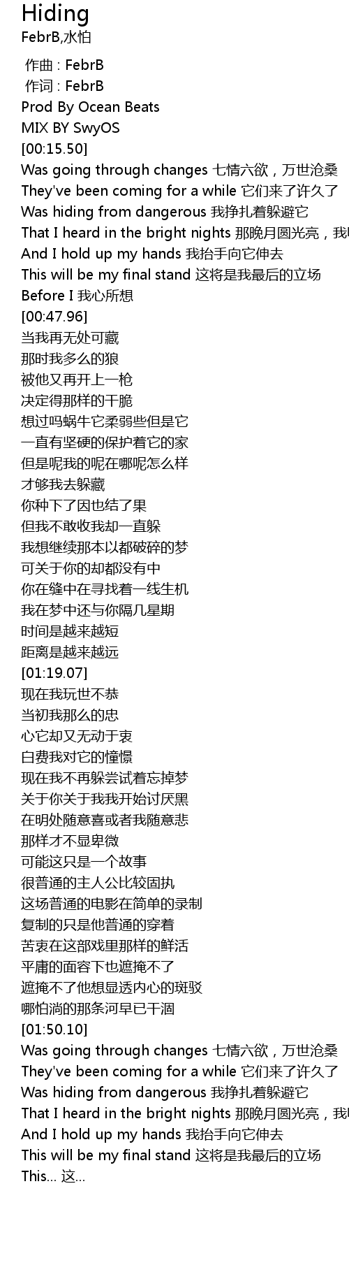 | [01:57.54] | Was hiding from dangerous wǒ zhēng zhá zhe duǒ bì tā |