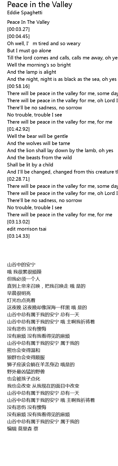 | [03:04.22] | There will be peace in the valley for me, for me |