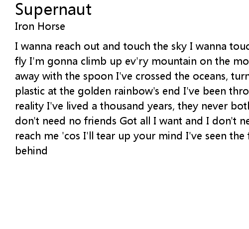 I wanna reach out and touch the sky I wanna touch the sun but I don't need to fly I'm gonna climb up ev'ry mountain on the moon, And find the dish that ran away with the spoon I've crossed the oceans, turned every bend I found the plastic at the golden rainbow's end I've been through magic and through life's reality I've lived a thousand years, they never bothered me Got no religion; don't need no friends Got all I want and I don't need to pretend Don't try to reach me 'cos I'll tear up your mind I've seen the future and I've left it behind |