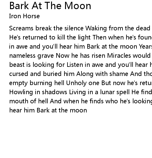 Screams break the silence Waking from the dead of night Vengeance is boiling He's returned to kill the light Then when he's found who he's looking for Listen in awe and you'll hear him Bark at the moon Years spent in torment Buried in a nameless grave Now he has risen Miracles would have to save Those that this beast is looking for Listen in awe and you'll hear him Bark at the moon They cursed and buried him Along with shame And thought his timeless soul had gone In empty burning hell Unholy one But now he's returned to prove them wrong Oh no Howling in shadows Living in a lunar spell He finds his heaven Spewing from the mouth of hell And when he finds who he's looking for Listen in awe and you'll hear him Bark at the moon |