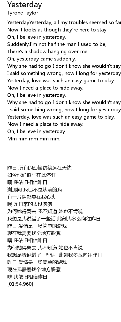 | [00:05.770] | YesterdayYesterday, all my troubles seemed so far away |