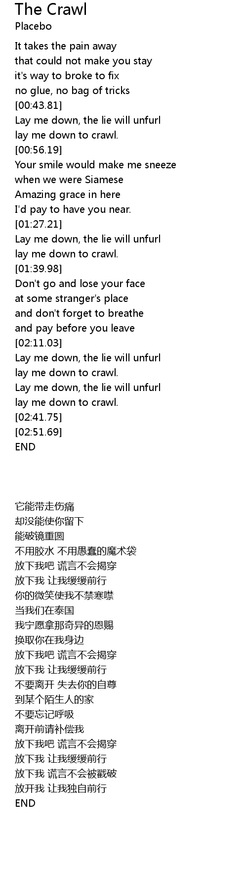 | [00:44.46] | Lay me down, the lie will unfurl |