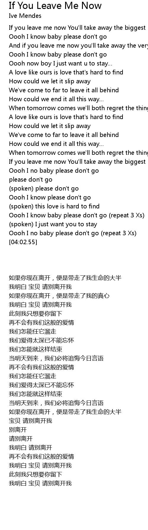 | [02:19.19] | If you leave me now You'll take away the biggest part of me |