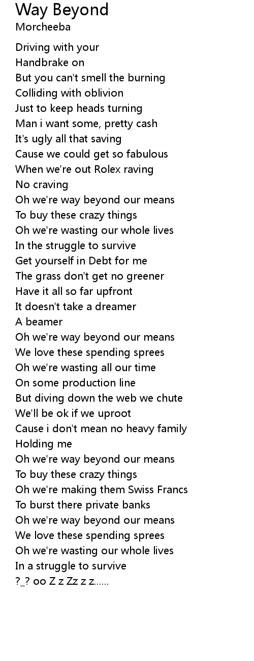 | [03:00.34] | Oh we' re way beyond our means |