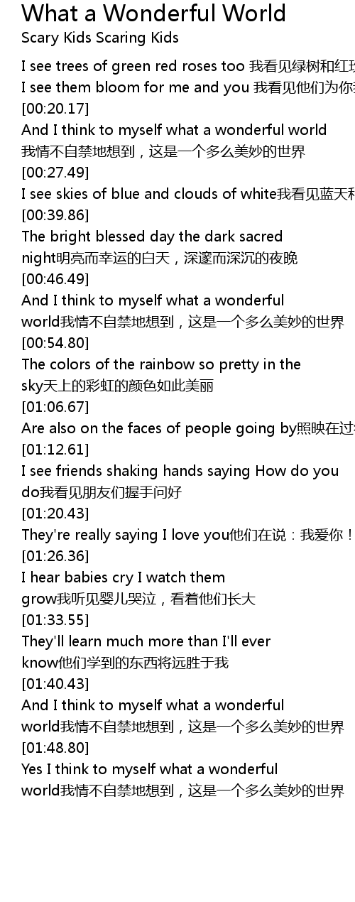 | [01:53.31] | Yes I think to myself what a wonderful world wo qing bu zi jin di xiang dao, zhe shi yi ge duo me mei miao de shi jie |