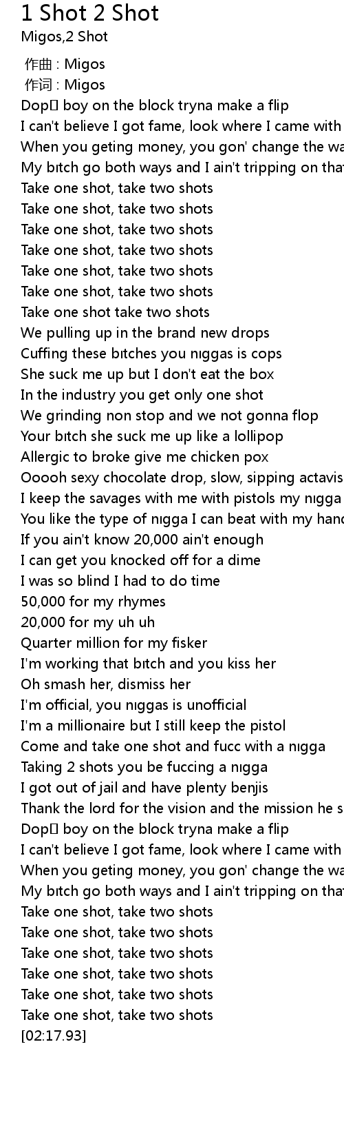 | [01:39.04] | Taking 2 shots you be fuccing a n gga |