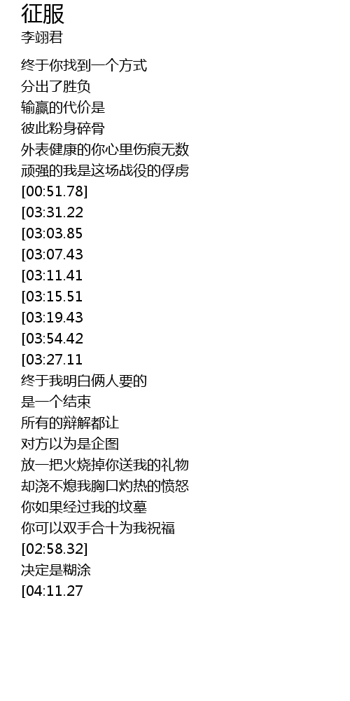 | [04:05.08][03:31.22][03:00.09][02:11.03][00:52.81] | 就这样被你征服 |