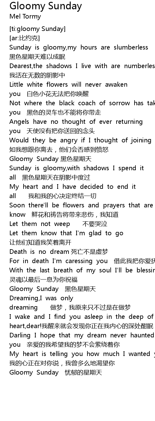 | [02:17.73] | Gloomy Sunday 黑色星期天 |