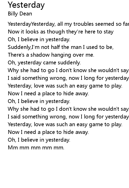 | [00:05.770] | YesterdayYesterday, all my troubles seemed so far away |