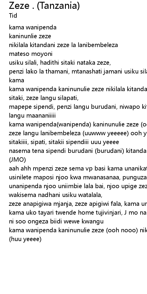 aah ahh mpenzi zeze sema vp basi kama unanikata, mpenzi zeze kabla hijawa balaa, usinilete maposi njoo kwa mwanasanaa, punguza goz goz machizi watakushanga, kama unanipenda njoo uniimbie lala bai, njoo upige zeze tupati tuwe hai wanga wakisema nadhani usiku watalala, |