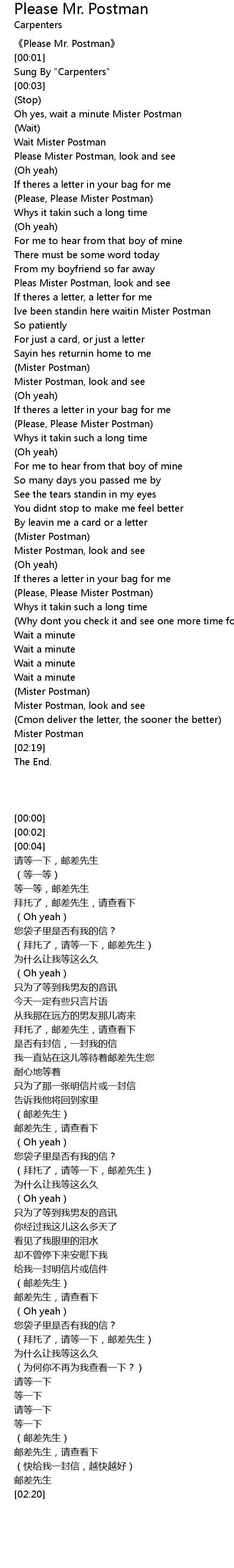 | [00:05] | Oh yes, wait a minute Mister Postman |