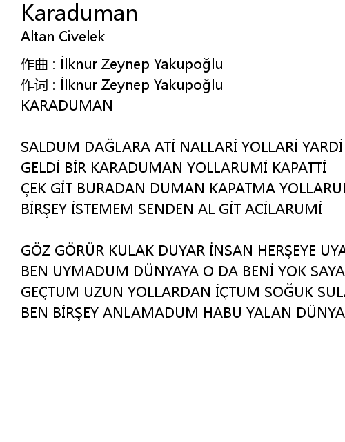 | 作词 : İlknur Zeynep Yakupoğlu | |