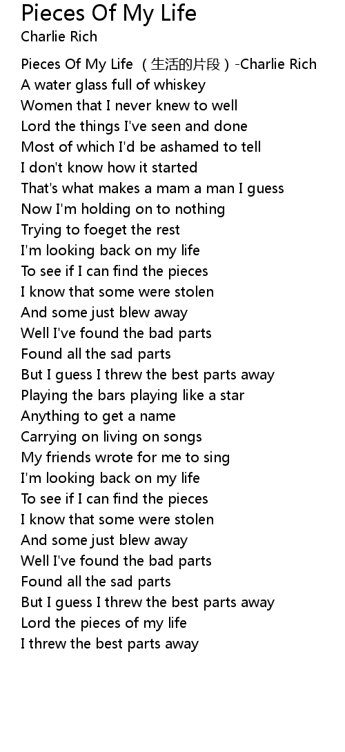 | [00:00.00] | Pieces Of My Life (生活的片段)-Charlie Rich |