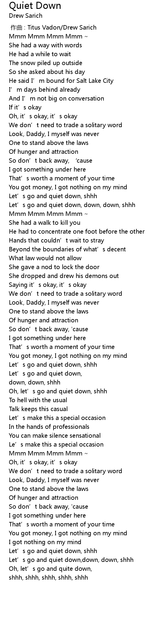 | [02:19.700] | Oh, let' s go and quiet down, shhh |