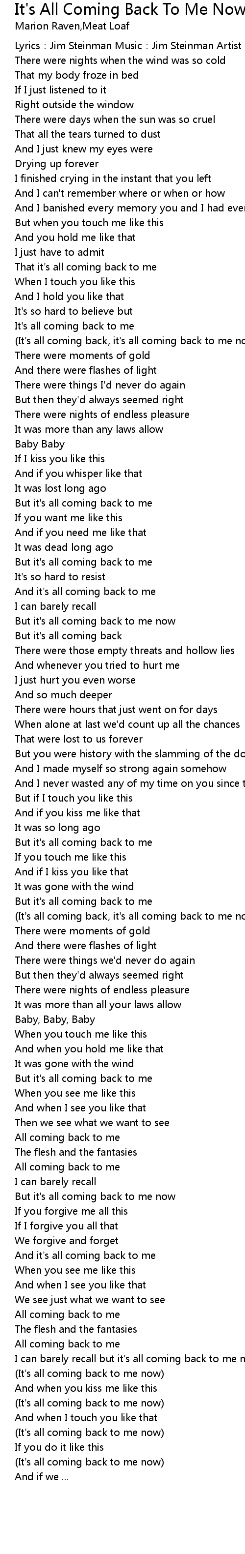 | Song | It's All Coming Back To Me Now |