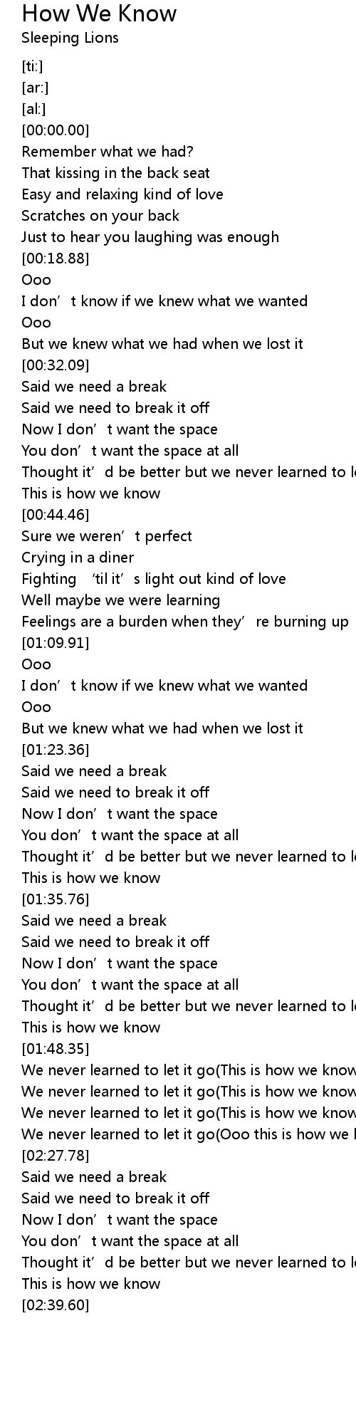| [02:24.56] | We never learned to let it go Ooo this is how we know |