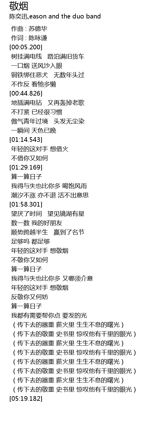 | [03:02.564] | 年轻的这对手 想敬烟 |