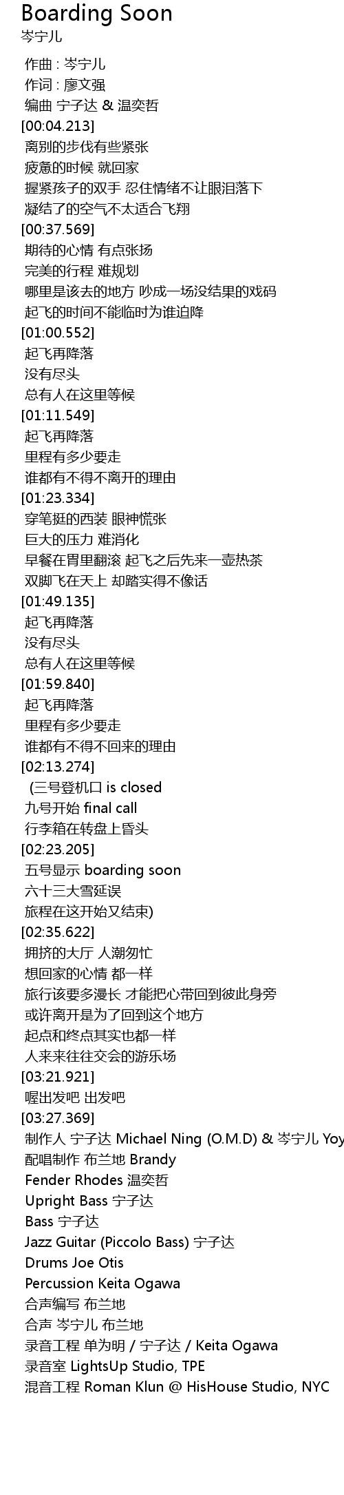 | [03:34.864] | 制作人 宁子达 Michael Ning (O.M.D) & 岑宁儿 Yoyo Sham |
