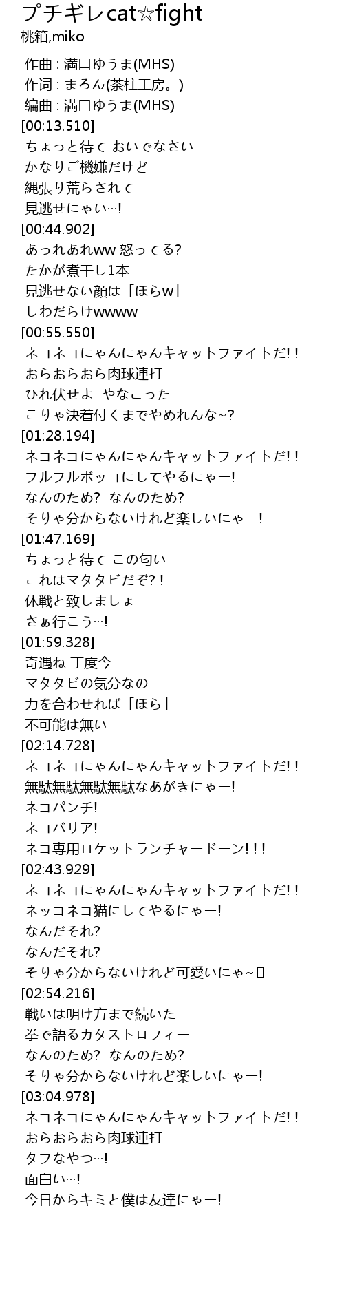 | [02:33.661] | ネコネコにゃんにゃんキャットファイトだ! ! |