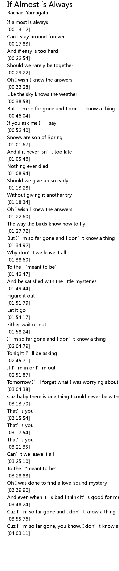 | [00:08.84] | If almost is always |