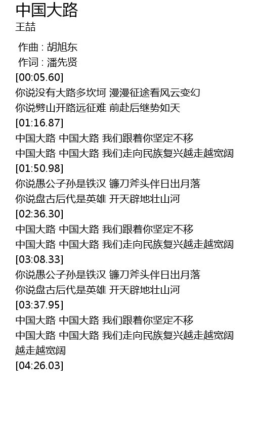 | [01:31.00] | 中国大路 中国大路 我们走向民族复兴越走越宽阔 |