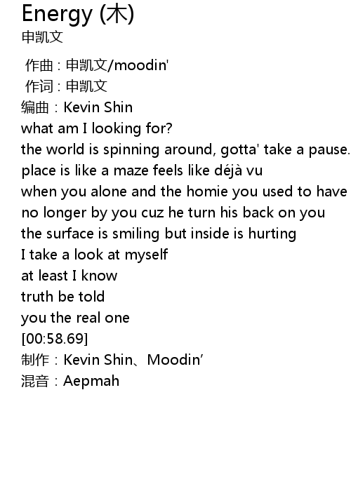 | [01:02.06] | 制作:Kevin Shin、Moodin’ |
