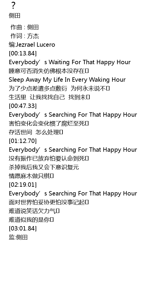 | [01:53.96] | Everybody' s Searching For That Happy Hour |