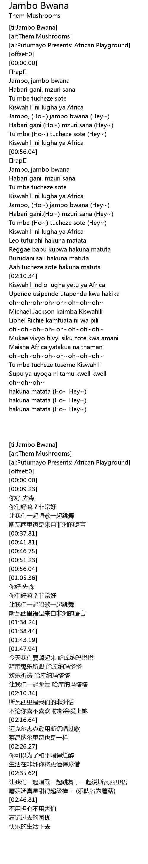 | [00:18.82] | Jambo, jambo bwana |