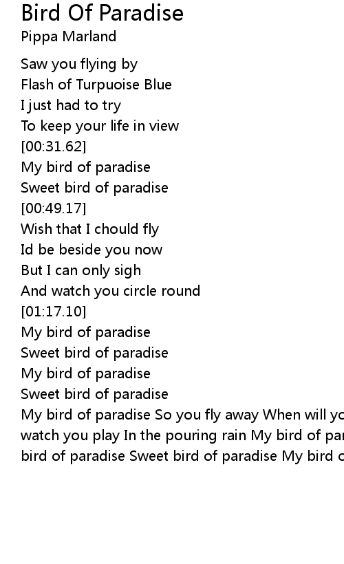 My bird of paradise So you fly away When will you come again So I can watch you play In the pouring rain My bird of paradise Sweet bird of paradise My bird of paradise Sweet bird of paradise My bird of paradise |